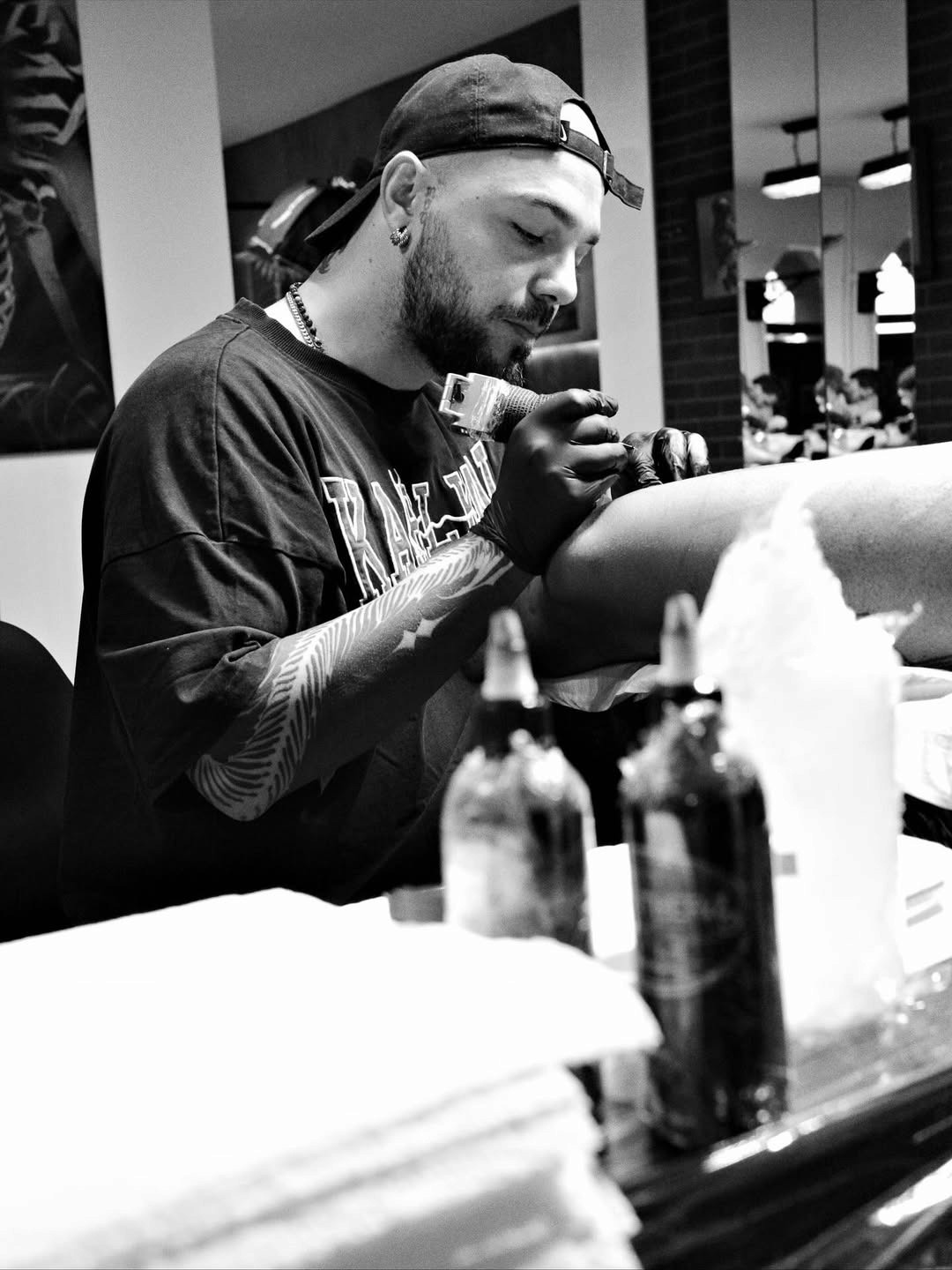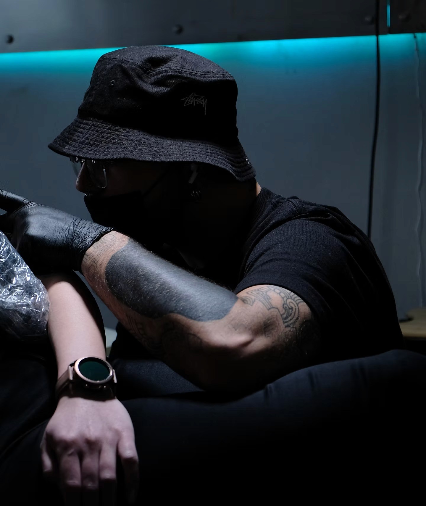 Ich bin Michael, ein Tätowierer aus Stuttgart. Mein Hintergrund in Grafikdesign und Fotografie prägt meine Herangehensweise an das Tätowieren, wobei ich einen starken Fokus auf Struktur, Komposition und Designs lege, die sich dem Körper anpassen. Ich tätowiere seit 2018 und erstelle individuelle Arbeiten, die sorgfältig geplant und so gestaltet sind, dass sie mit der Zeit gut altern.